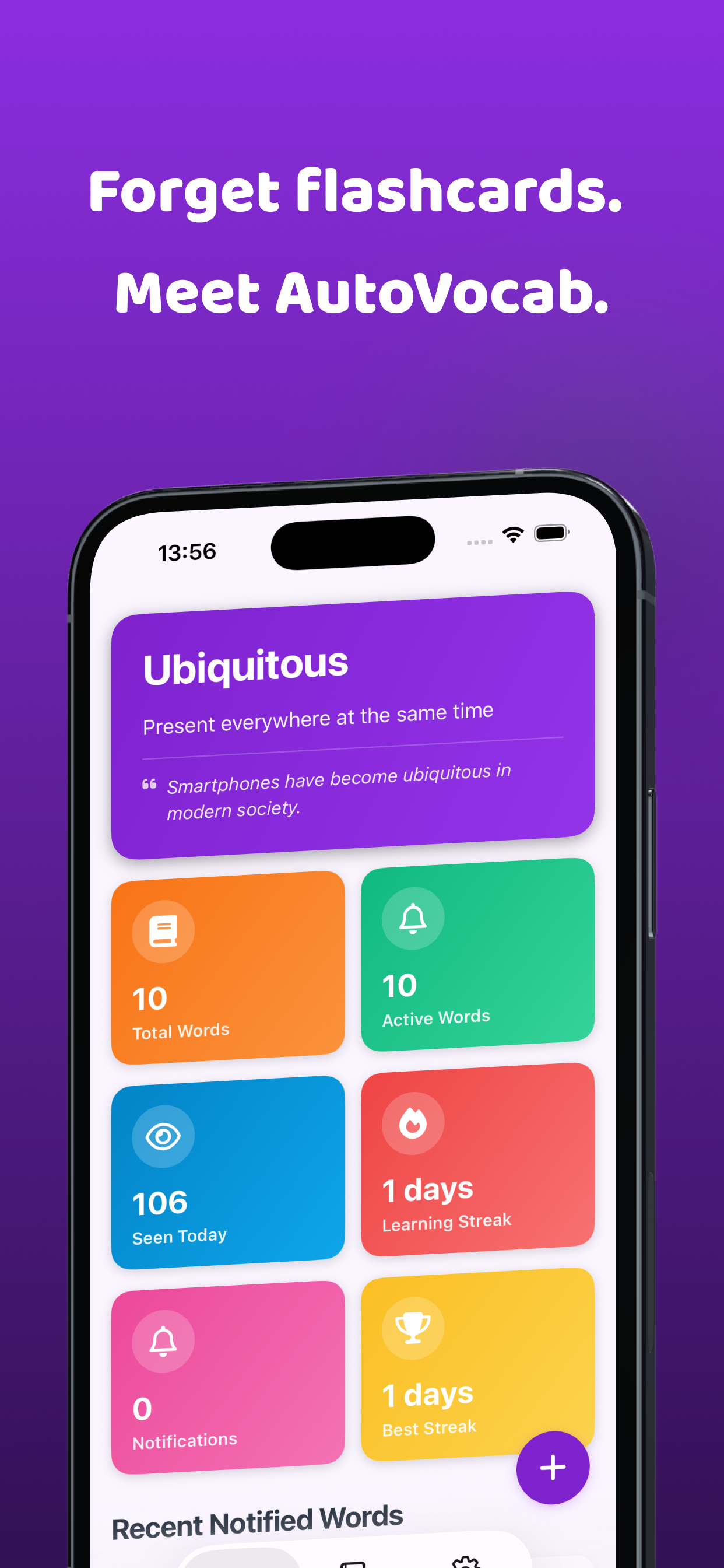 AutoVocab sends vocabulary words to your phone throughout the day—no app-opening required. Just add words, set your schedule, and learn passively.